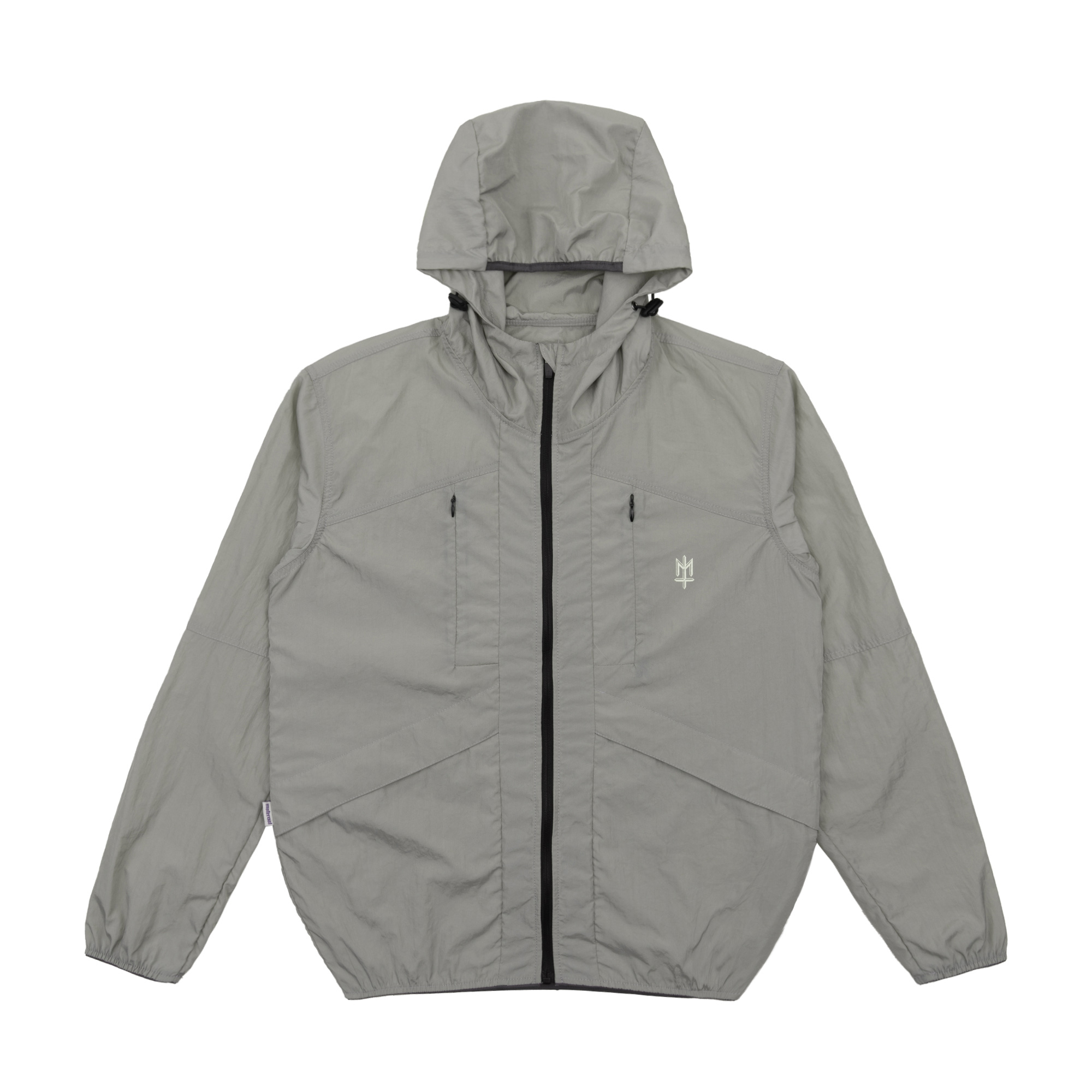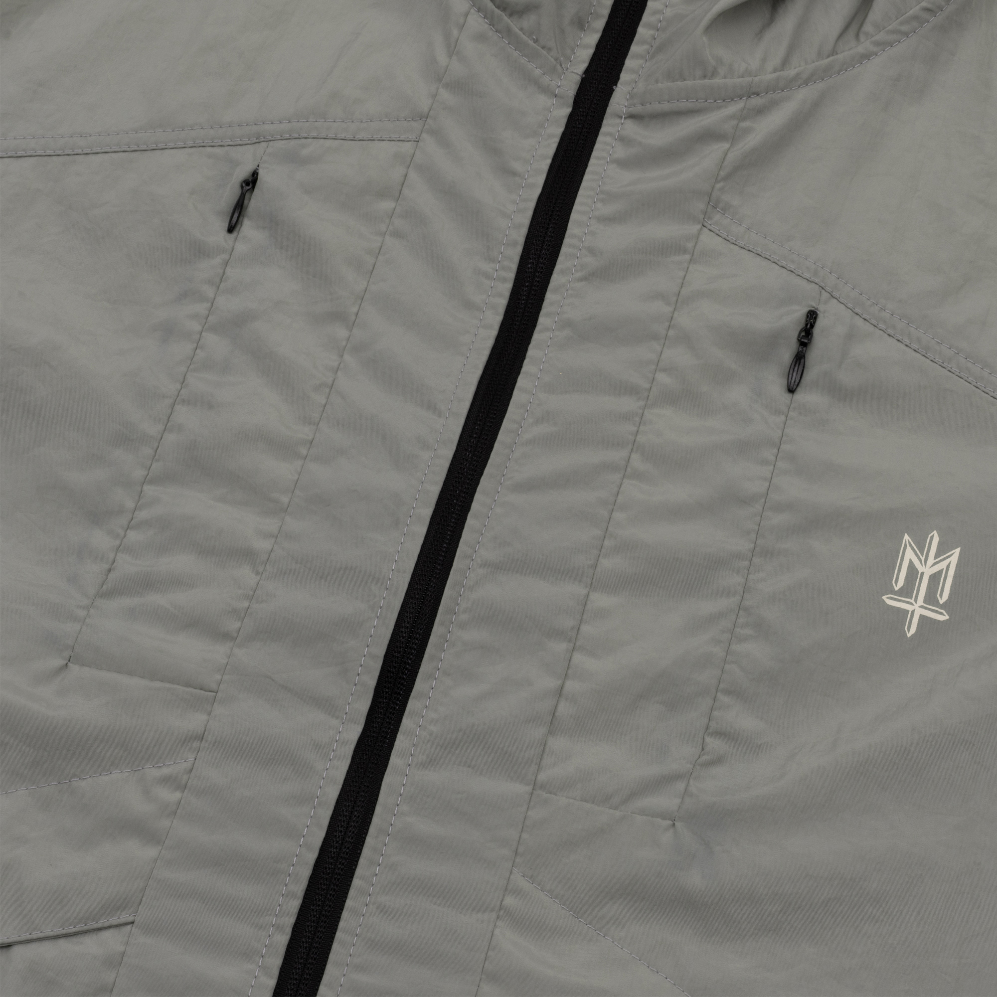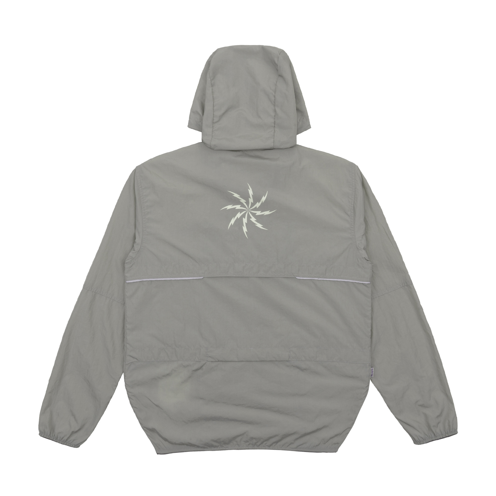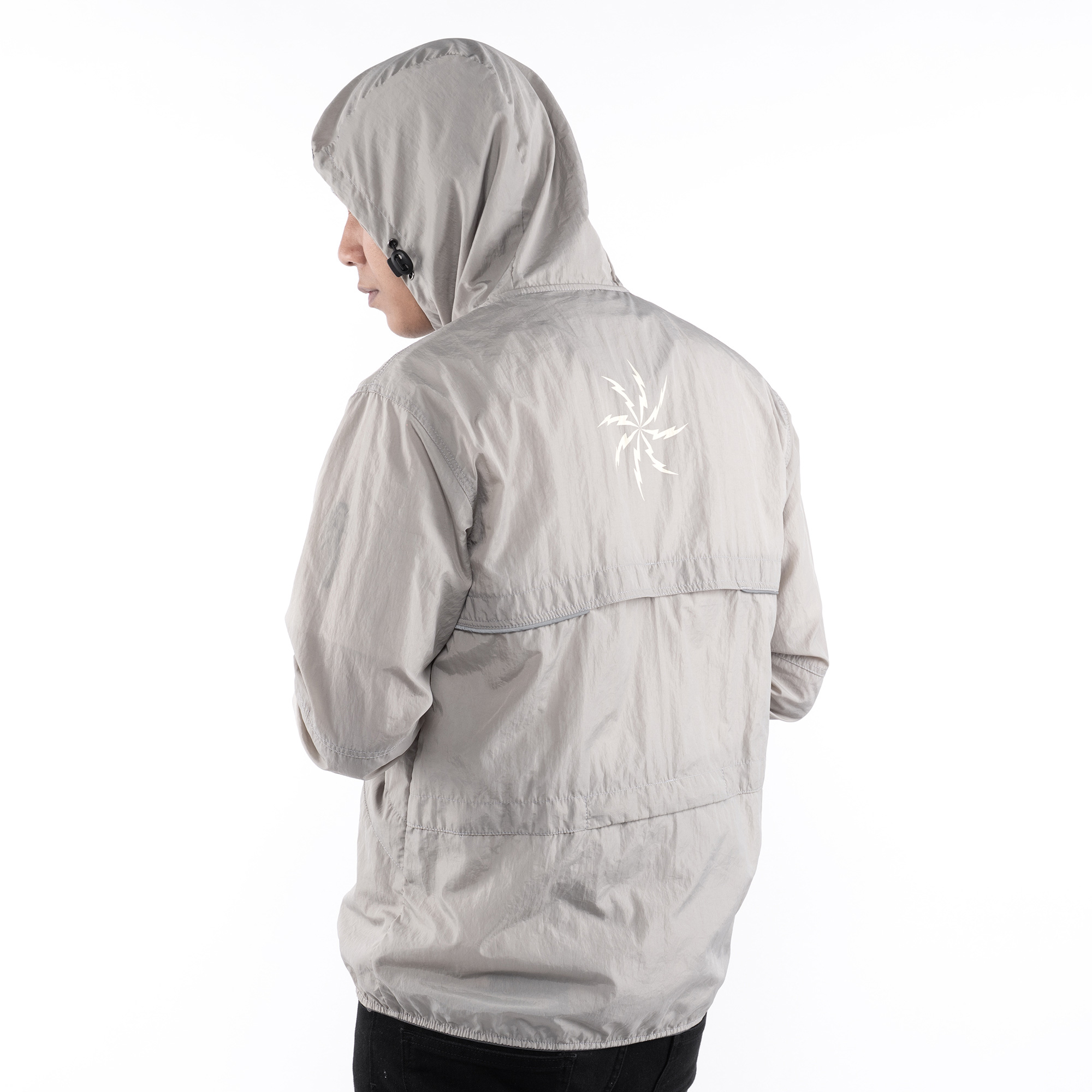 Grey lightweight polyester foldable running jacket with broken white ink screen print.