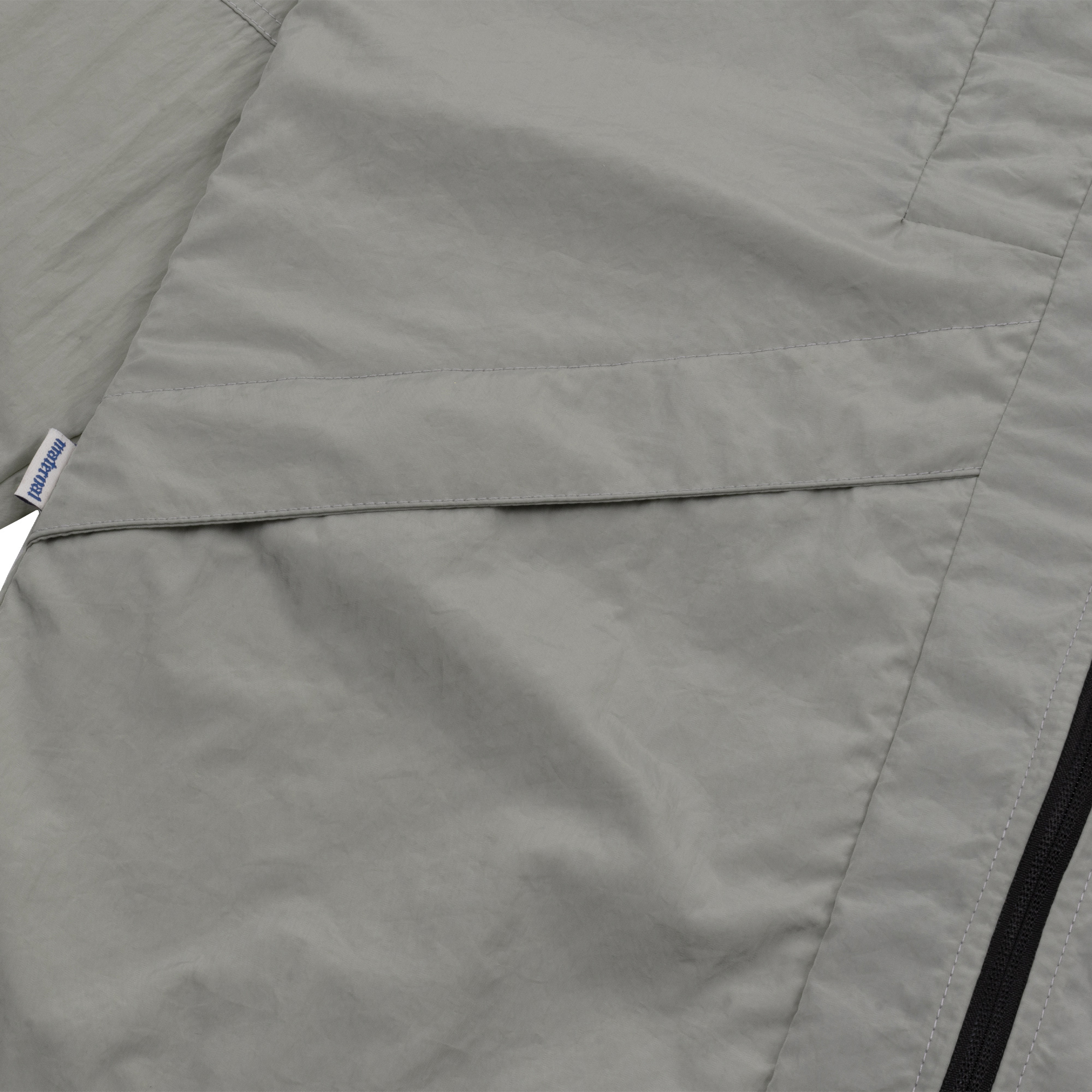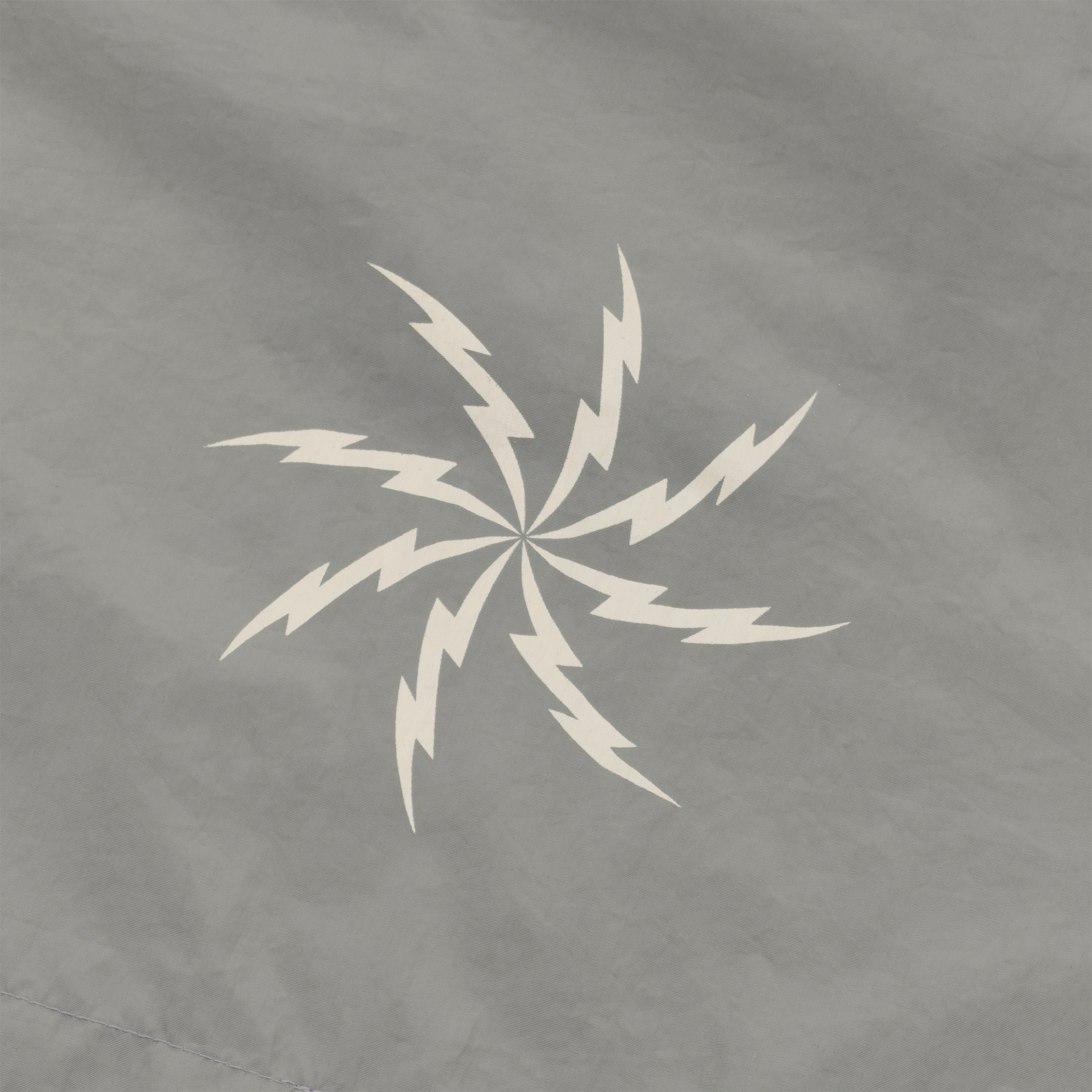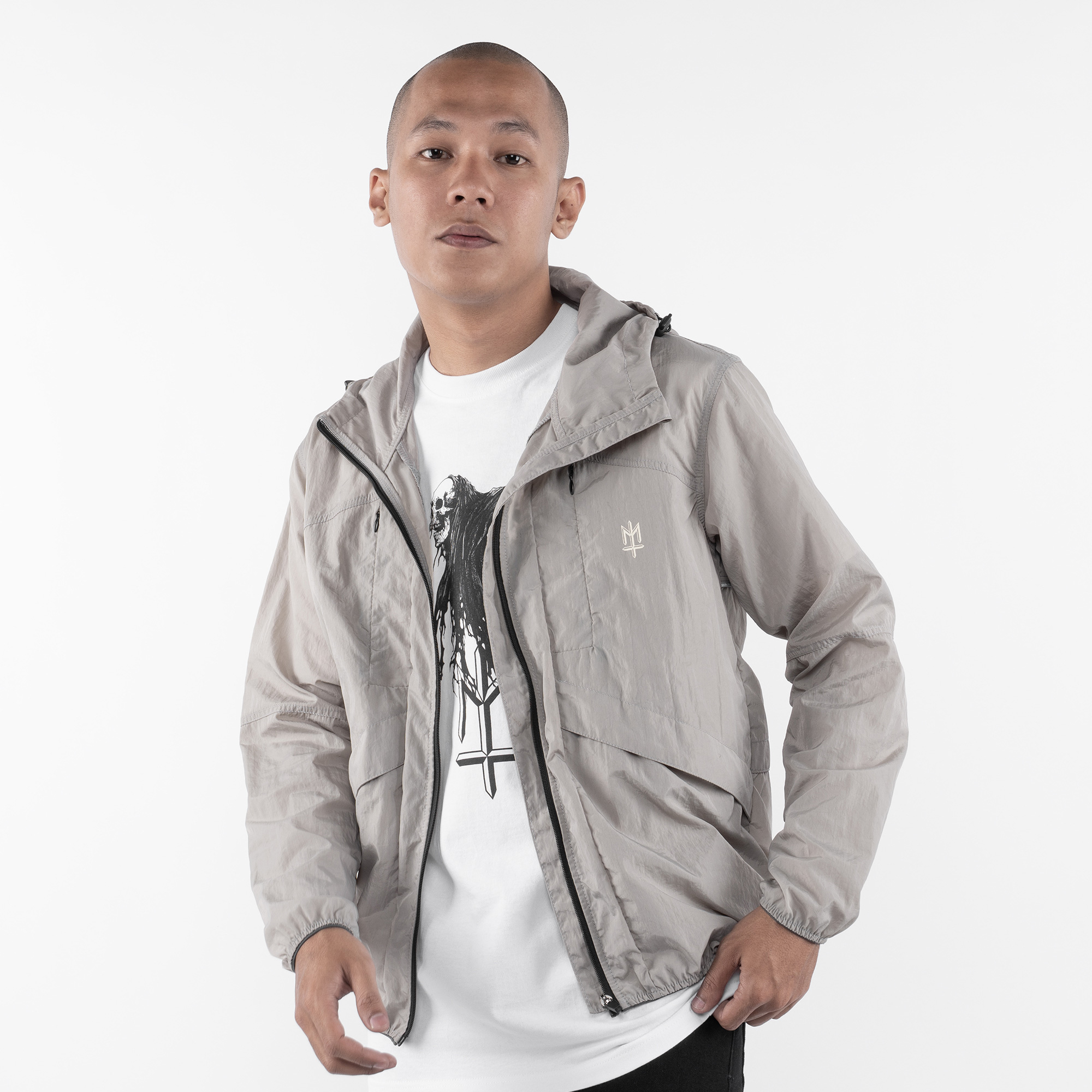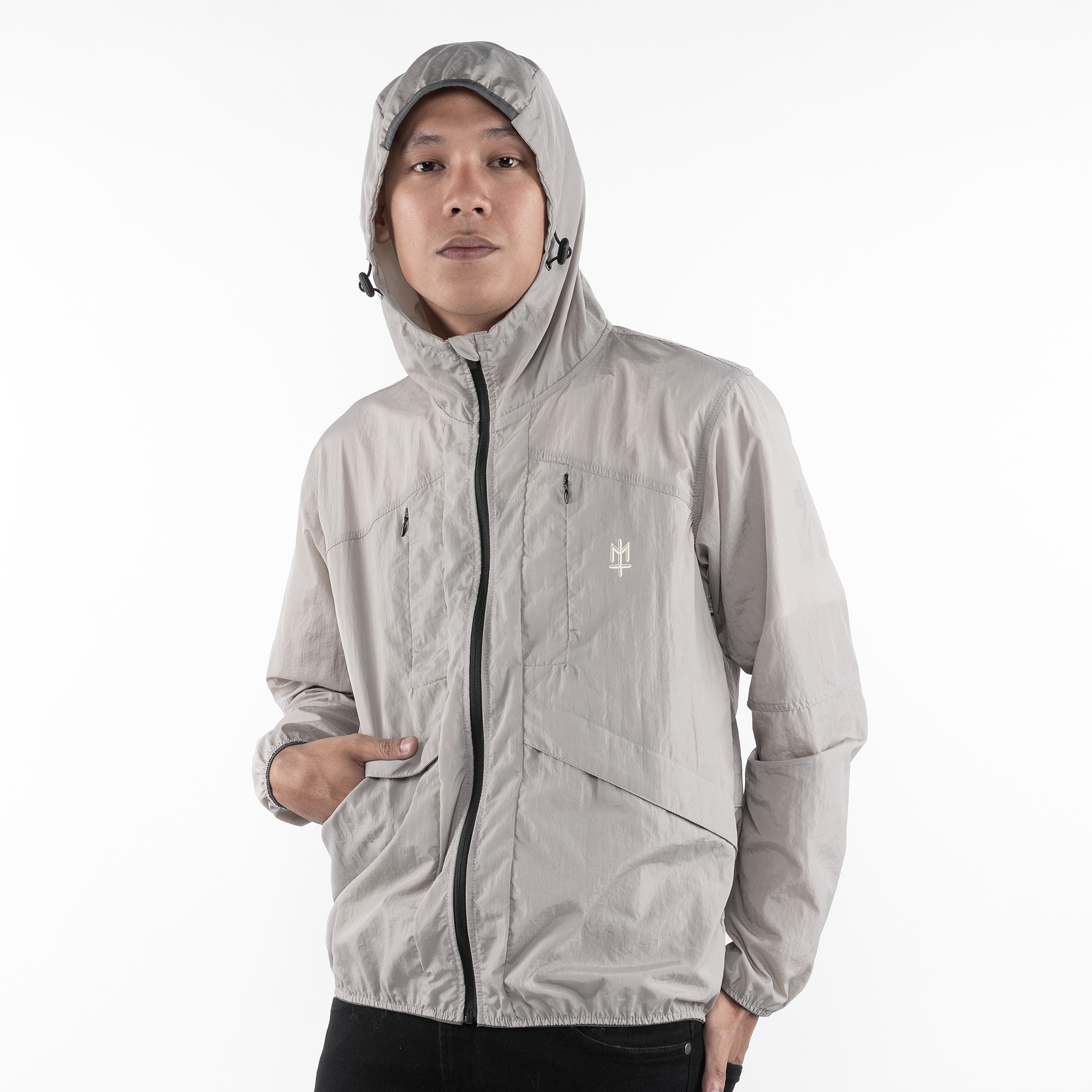Grey lightweight polyester foldable running jacket with broken white ink screen print.