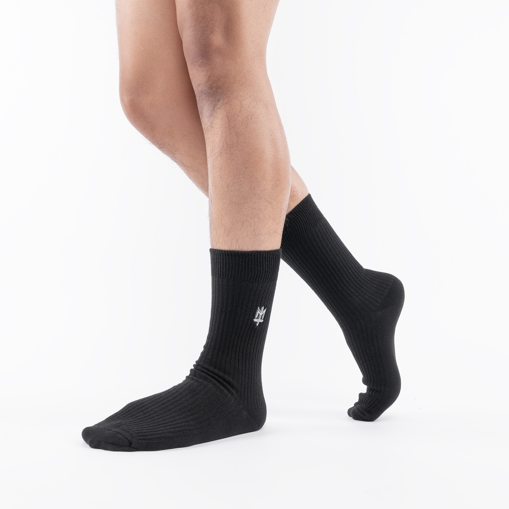 Black cotton spandex crew socks with white direct embroidery.